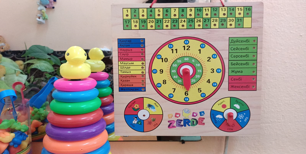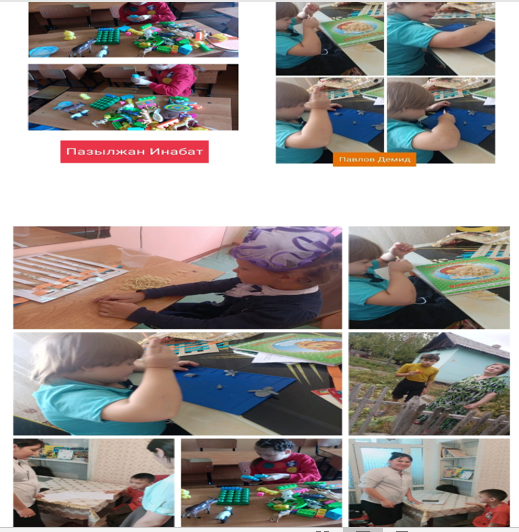 - «Санау» жаттығуы сандарды қайталау. Таяқшалар арқылы санау және түстерді біріктіру жаттығулары жасалды.Мүмкіншілігіктерінше әріптерді қайталады.
