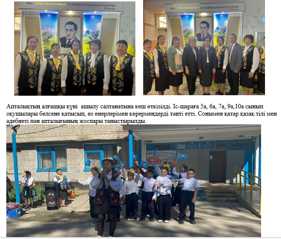 25.09 - 29.09 аралығында «Тіл білімі – сөз әлемінің құпиясы» атты тақырып аясында пән апталығын өткізді. Мақсаты: Оқушыларға рухани құндылықтарға негізделген білім беруді жүзеге асыру.Халқымыздың мол мұрасымен таныстыру, пәннің адам өміріндегі маңыздылығын түсіндіру, тілдің мемлекеттік мәртебесін қалыптастыру. Оқушылардың ана тіліне деген сүйіспеншілігін арттыру.Қазақ халқының әдебиетін негізге ала отырып, көркем-әдеби шығармалардағы кейіпкерлердің игі істерін насихаттау арқылы адамгершілікке, бауырмалдыққа тәрбиелеу. Ұлы Абай мен М.Әуезовтің өмірі мен шығармашылығын дәріптеу және мазмұнын терең ұғына білуге үйрету.