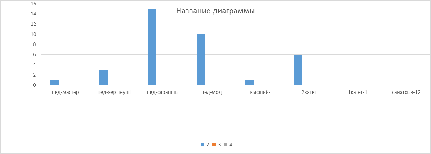 педагог –зерттеуші -1, педагог- сарапшы-3, модератор-4, 2020-2021 оқу жылында педагог- шебер-1, жылында педагог – зерттеуші –1, педагог- сарапшы-12, модератор-10 болды.2021-2022оқу жылында педагог-шебер-1, педагог – зерттеуші –3, педагог- сарапшы-15, модератор-10 болды