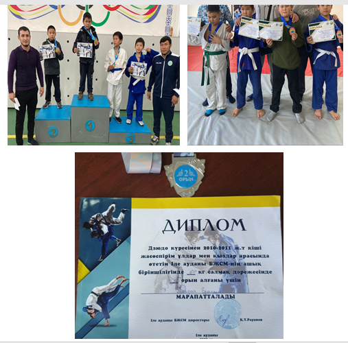 Дзюдо күресінен 2010-2011,2012-2013,2014-2015 ж.т кіші жасөспірімдер арасында Еңбекшіқазақ ауданының ашық біріншілігінде +46 салмақ дәрежесінде
