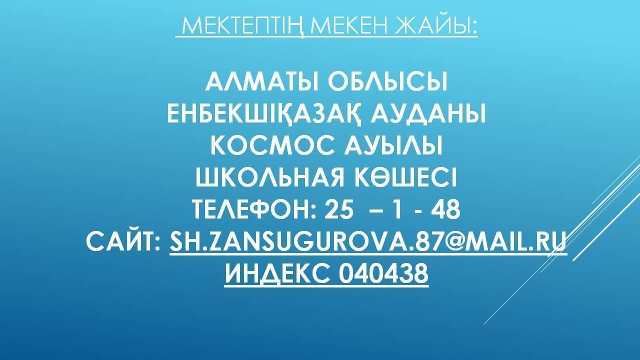 Мекен-жайы » І.Жансүгіров Средняя школа имени ө МДШО
