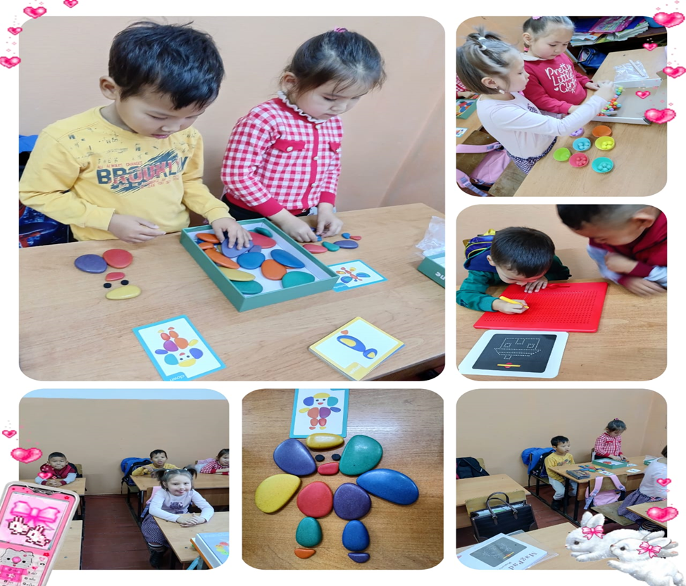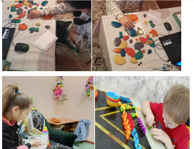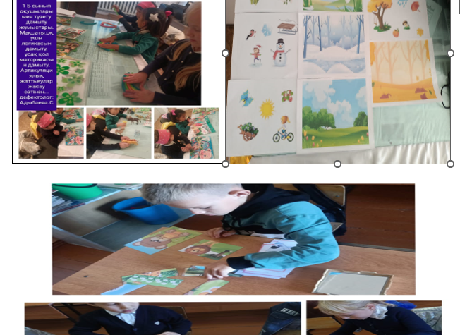 Көру ,есту, сөйлеу қабілеті бұзылған, сөйлеу тілінің бұзылыстары бар балаларға психологиялық көмек көрсету арқылы үйретілді.Қоршаған ортаны бағдарлауын қалыптастырылып,айналасын қоршаған өзі отырған жерді.баратын жерін дұрыс бағдарлау үйретілді.Қажетті психофизикалық қызметтің деңгейін дамыту бойынша .Нейро гимнастикалық жаттығулар жасалды. Артикуляциялық жаттығулар жасалып нейро жаттығулар жасалды.«Сіріңкемен немесе санау таяқшаларымен санау арқылы әр түрлі пішімдер жасау »жаттығулары жасалды.