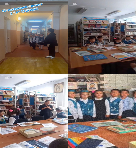 Жұмыс түрі:  1-сынып оқушыларына кітапхана көрсетіліп,кітапхана ережесімен және білім алу тәртібімен таныстырылды.Кітапхана білім нәріне толы жер болғанмен сол білімнің бастауы мұғалім екені жайлы талқылады.Сол себепті кітап көрмесі арқылы жасалатын жұмыстар жаңа келген оқушылардың алдына берілді .
