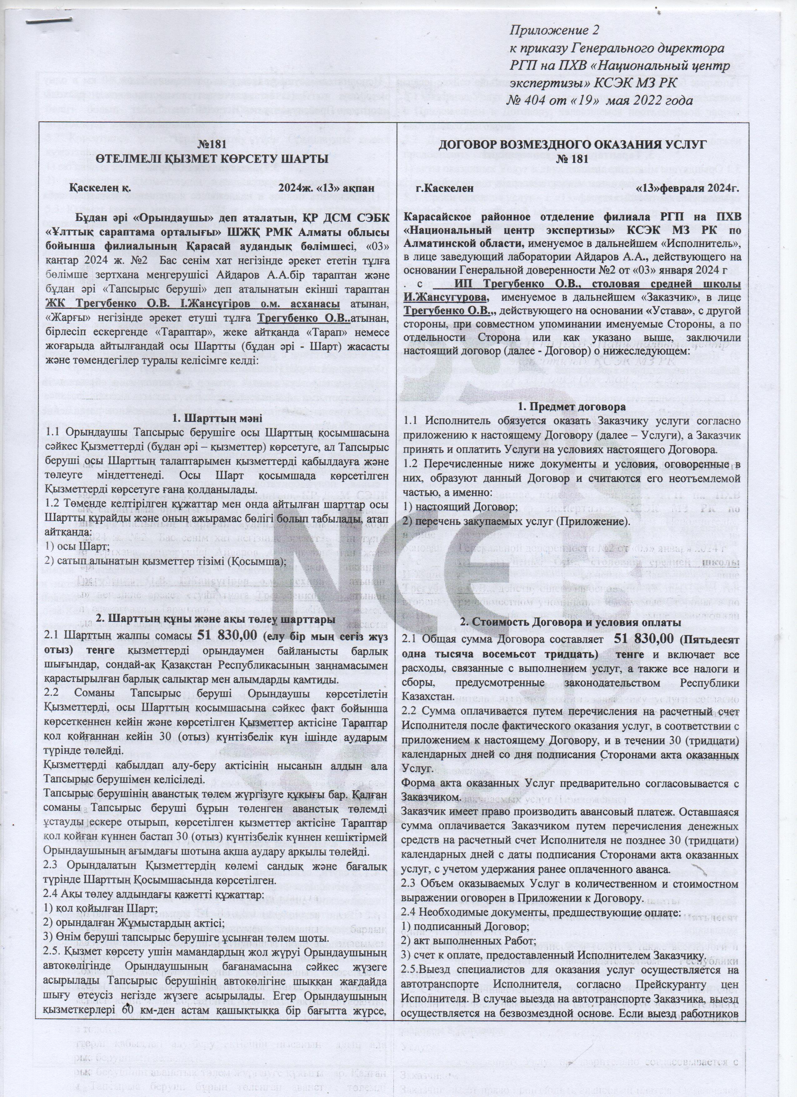 Бұдан әрі «Тапсырыс беруші» деп аталатын "Алматы облысы білім басқармасының Еңбекшіқазақ ауданы бойынша білім бөлімі" мемлекеттік мекемесі, Ереже атынан Басшысы Толеубекова Арайлым Аксубаевна бір тараптан және бұдан әрі Өнім беруші деп аталатын ИП "ТРЕГУБЕНКО", Өнім берушінің негіздемесі негізінде әрекет ететін Директор Трегубенко Ольга Васильевна екінші тараптан, көрсетілетін қызметтіі таңдау жөніндегі п.80 правил организации питания обучающихся. Заключение договора на последующий финансовый год (продление). конкурстың қорытындылары туралы жылы жасалған хаттама негізінде қызмет көрсету туралы осы Шартты (бұдан әрі – Шарт) жасасты және төмендегілер туралы келісімге келді: