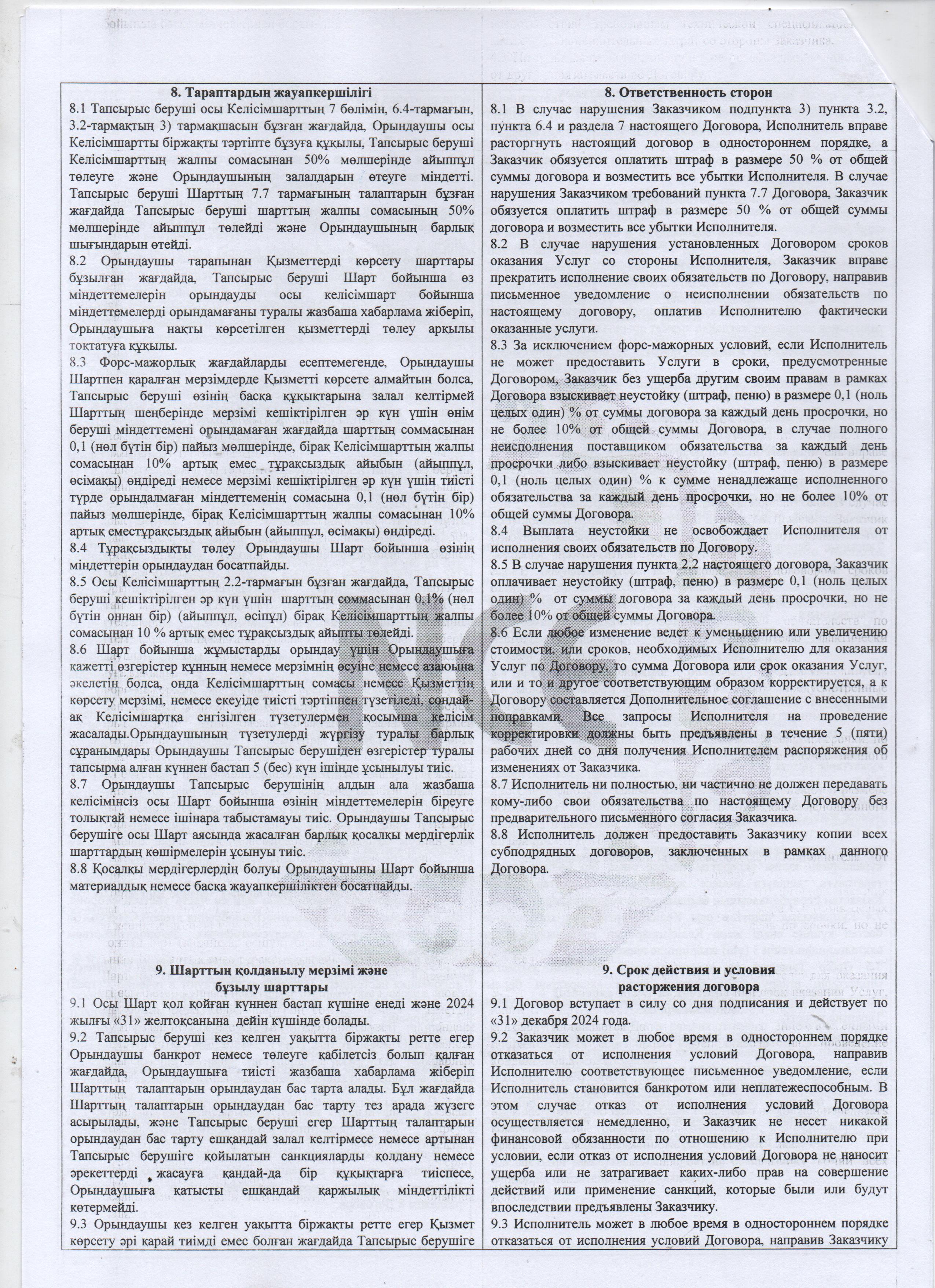 8.1    Шарт «Тапсырыс беруші оны Қазақстан Республикасы Қаржы министрлігінің аумақтық қазынашылық бөлімшесінде тіркегеннен кейін» күшіне енеді және 2024-12-31 жылы әрекет етеді.